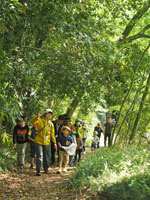 - 風もなく穏やかな青空のもと、ステップアップ写真講座「黄葉と構図えらび」を開催しました(写真)。色づいたコナラの葉や標柱10〜11番のトネアザミの綿毛を被写体に、光線のとらえ方や構図での見せ方を実践形式でレクチャー。ケヤキやエノキの樹形を生かした撮影術では、スマートフォンのズーム機能を使った撮影のコツについても紹介しました。