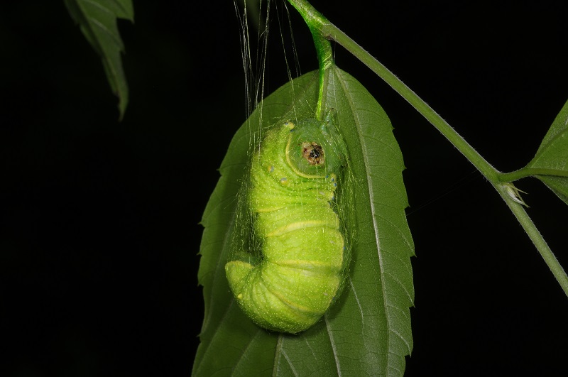 - 標柱12番の林沿いの枝に引っ掛かっていた落ち葉。そこに付いていた何か。最初は虫が反り返っているように見えましたが、正体はリンゴコブガの幼虫でした(写真)。本来この時期は繭になっているはずなので、おそらくは菌によって繭になる前に命を終えたのだと思われます。脱皮をするたびに、自分の頭部の上に頭部の殻を積み上げるという、変わった習性を持ったケムシです。