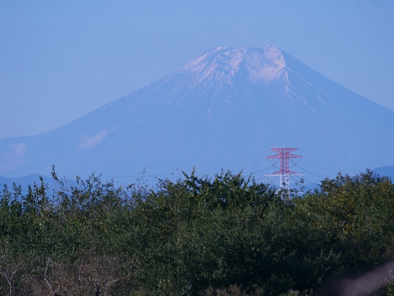 - ひんやり澄んだ空気と高い青空。秋をぐっと感じる天気でした。こんな日はもしかしたら! と、向かった桜土手からは、先日初冠雪の頼りが届いたばかりの富士山が望めました(写真)。