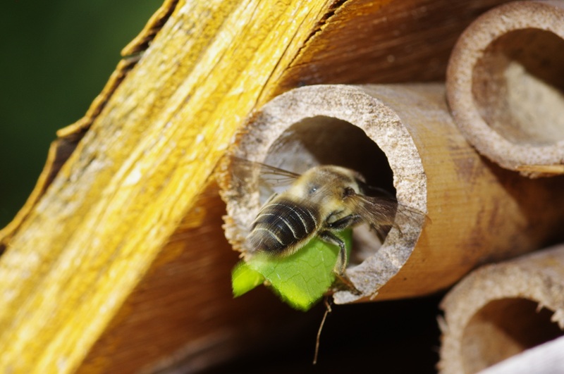 - センター前の草地に設置しているハチ宿。晩秋のいま、流石にもう利用しているハチはいないだろうなあ、と思いつつ見に行ったところ、いました、いました。ハキリバチの仲間が盛んに巣材の葉を切り取って竹筒の中に運んでいました。ドロバチとは異なり、部屋の仕切りに葉を利用します。かわいらしい後ろ姿(写真)をパチリ!