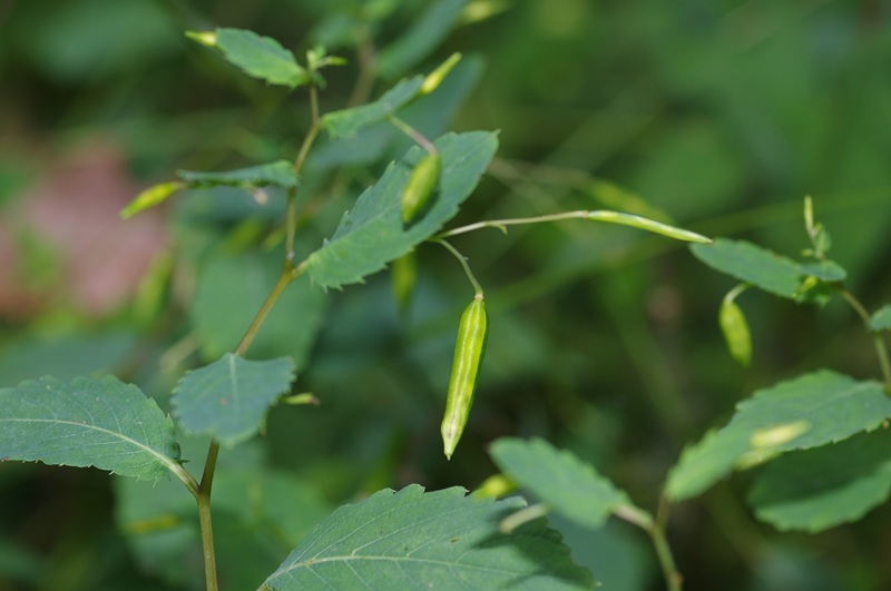 - 木道沿いに咲いていたキツリフネに果実が実っていました(写真)。ワタラセツリフネソウもキツリフネも、熟した果実は手で触れると中の種子がはじけ飛びます。それでキツリフネの英名は「touch me not」。意味は「私にさわらないで」。なかなかおつな命名です。また、標柱20番付近で久しぶりに開花が確認されたタカアザミにも、たくさんの種子ができていました。