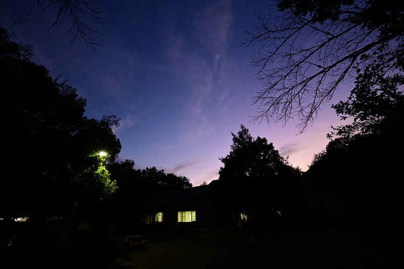 - 気持ちの良い青空が広がった今日は、野外の催しが盛況でした。「定例自然かんさつ会」や「どんぐりスタンプラリー」に加え、センター入口のひさしの下に設置している、スタッフ手作りの遊具「どんぐりコロコロ」コーナーも大人気! 子どもたちが入れかわり立ちかわり訪れて、両手いっぱいのクヌギのどんぐりを転がして遊んでいました。閉館後、昼間のにぎわいが嘘のように辺りが静まり返るころ、空が美しい夕暮れ色に染まりました(写真)。