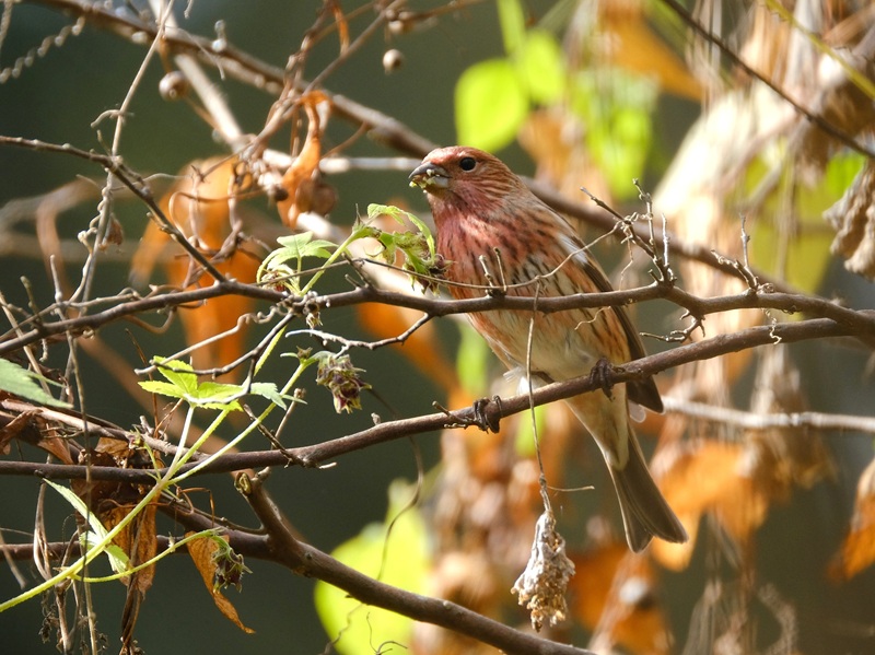 - 今日のハイライトは朝一番にやってきました! めだかのT字路に下りてきた1羽の小鳥。羽が赤みを帯びていたので、初めはベニマシコかな? と思ったのですが…。ちょっと体やくちばしが大きいような気がして、確認のために写真を撮ると、なんと正体はオオマシコ(写真)でした!! 園路から数メートル先の茂みの中でカナムグラの種子をもぐもぐ。今回が公園内初確認です。これで、公園の野鳥記録は182種になりました。