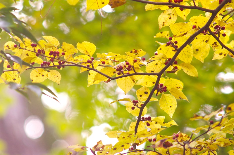 - 冷え込みが強くなり、黄葉が少しずつ目立つようになってきました。ヤマノイモやムクノキ。アオハダは赤い実とのコントラストがとにかく鮮やか(写真)。観察は、標柱5番付近がおすすめです。