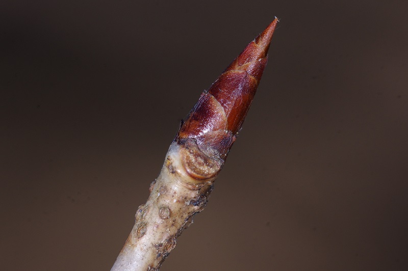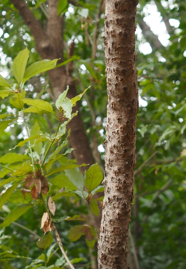 - 冬芽や葉痕の観察とあわせて楽しみたいのが、個性豊かな樹皮の観察。写真は、スタンプを並べて押したような模様の標柱21番のシロダモです。