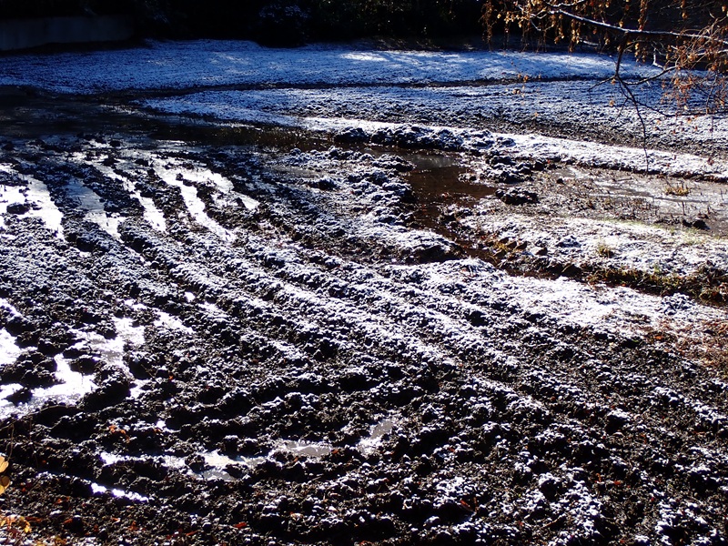 - 快晴。すでに耕転が終わった湿地エリアでは、昨夜の雪が残って美しい風景を生み出していました(写真)。林内のヤブコウジにも雪。桜土手からは、富士山がくっきり見えました。