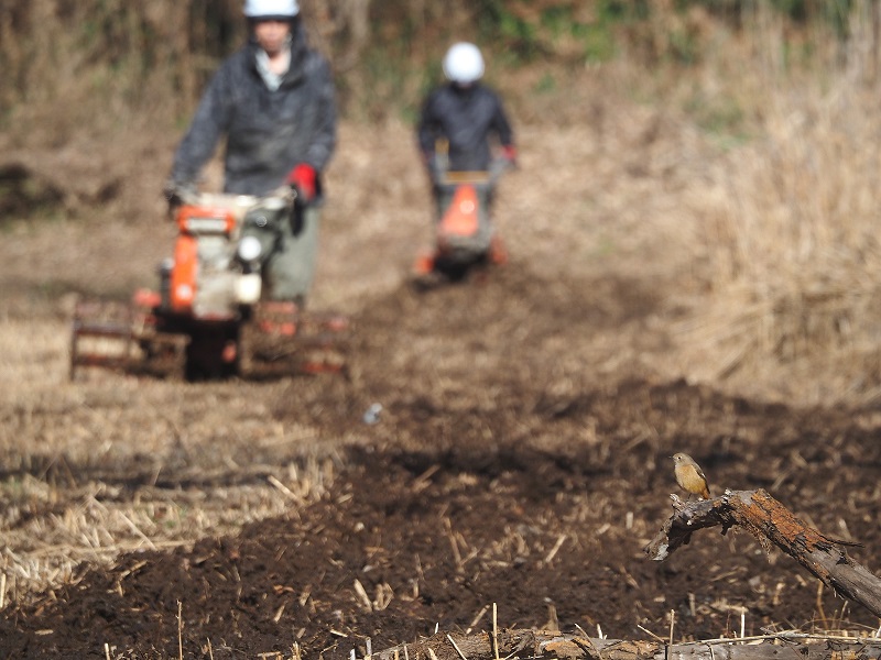 - 湿地の耕耘作業も終盤。めだかのT字路では、耕されたあとから食べものを探すジョウビタキや、セキレイの仲間が見られました(写真)。作業が休憩に入り、人が離れてからやってきたのはモズ。停止した機械の上から周囲を見回しては、地面に降りて虫を捕らえていました。