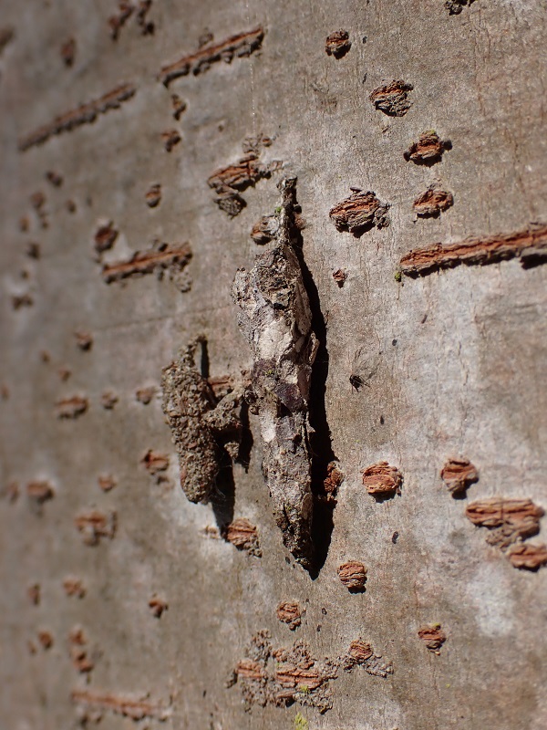 - 標柱10番のケヤキの幹に、隣り合ってぶら下がっていた「モノ」(写真)。最初はどちらもミノムシかと思いましたが、じっくり観察すると、小さい方はおそらくシロスジシマコヤガの繭。柄のついたたわら型で、地衣類の破片などで繭を覆うのが特徴です。ちなみに、もう一方はクロツヤミノガ。枯葉の破片でみのを作ります。