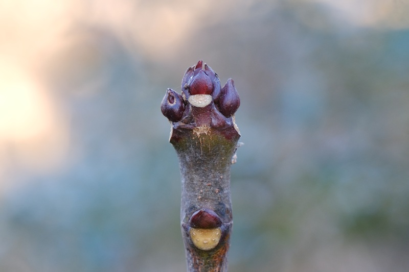 - 写真は標柱5〜6番間の園路脇のゴンズイの冬芽です。光沢のあるえんじ色でぷっくりと膨らみ、公園で見られる数多の樹木の冬芽の中でも、特に筋骨隆々という感じがします。ゴンズイといえばツートンカラーが際立つ実が有名ですが、この木はまだ150pほどの幼木で、昨年までは結実していません。実をつけたら園路から観察しやすそうなので、今から楽しみです♪