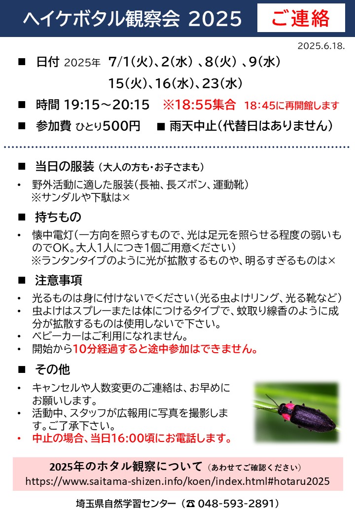 - 申込: Googleフォームによる事前申込制(応募多数の場合は抽選)。受付期間7/3(木)の9時〜7/8(火)の17時。「ヘイケボタル観察会」との重複当選はありません。