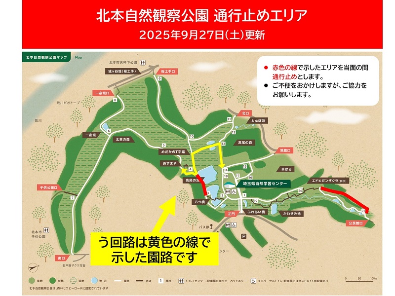 - 標柱3〜4番の園路脇のハチの巣の活動が活発化しているため、当面のあいだ、該当箇所を終日通行止めとします。めだかのT字路からのう回をお願いします(地図参照)。