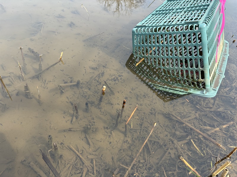- ニホンアカガエルの卵塊調査6回目を行いました(写真)。シュレーゲルアオガエルの「コロコロ…」やヒガシニホンアマガエルの「ゲッゲッゲッ…」などの鳴き声をBGMに、湿地内を探索。新たな卵塊はなく、スタッフが少し前に見つけたものを合わせて累計は590個でした。オタマジャクシたちが成長して役目を終えたカゴは、ボランティアのみなさまと一緒に回収。ご協力ありがとうございました!