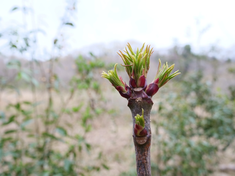 - 穏やかな陽気の一日。標柱4〜5番間ではイヌザクラが芽吹き始めました。赤い芽鱗が持ち上がり、今は黄緑色の新葉とのコントラストがきれいです。