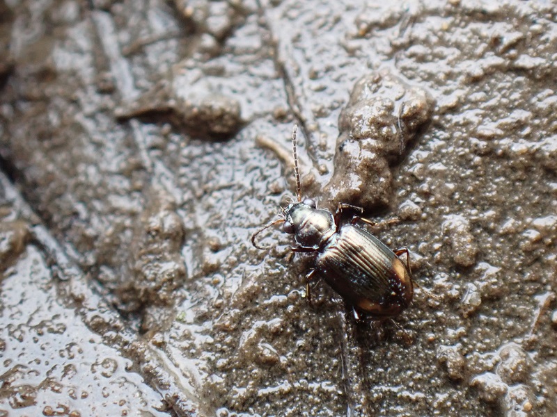 - 雨が降り続きました。野鳥や昆虫の姿は少なく、物静かな園内。ですが、標柱13番付近の水辺をしゃがんで観察すると、トゲヒシバッタのほか、体長3.5mmほどのアトモンミズギワゴミムシ(写真)が跳ねたり、走ったり。水中では、少し大きくなったニホンアカガエルのオタマジャクシがすいすい泳いでいました。