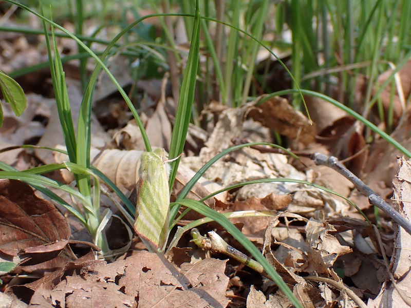 - 標柱15番付近の園路脇で毎年見られるウラシマソウは「埼玉県レッドデータブック植物編 2024」で準絶滅危惧の植物。そろそろ芽生えていないかな〜と様子を見に行きました。特徴的な葉の形を頭に思い浮かべながら探しましたが、見つからず…。かわりに、半透明の細いタケノコのようなものを発見しました。えっ、もしや、これがそうなの? と調べてみると大正解! この「鞘状葉」に包まれた芽の中から、団扇形の葉、そして花が展開します。