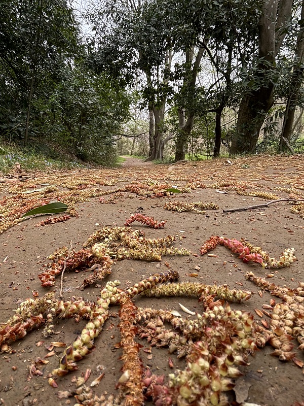 - 強い南風が吹きました。センター前ではソメイヨシノ、標柱4番や5〜6番の林沿いではヤマザクラの桜吹雪が降り注ぎました。標柱6番では、花穂が黄緑色のイヌシデと、赤色のアカシデの両方が見られ、それぞれの落花が園路に色を添えていました(写真)。