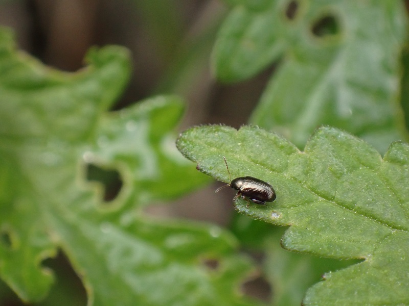 - 標柱7番〜南口の園路脇に群生しているカナムグラ。やっと若葉が広がり始めた頃なのに、もう虫食いの痕が目立ちました(写真)。何がいるのかじっくり探すと、ぴょんっ! と飛び跳ねて逃げるアサトビハムシが見つかりました(クリックで拡大)。カナムグラの葉を食べます。また、同じように飛び出してきたのはイナズマヒメヨコバイ。こちらは葉の汁を吸います。どちらも大きさは2〜3mmほどです。
