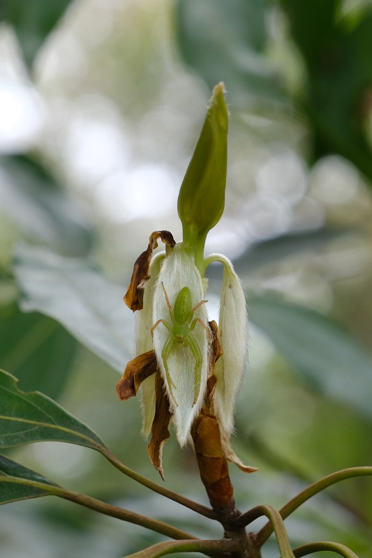 - 標柱21番近くのシロダモが芽吹き、若葉がひろがっていました。そこにいたのはワカバグモ(写真)。緑の中になじむ体色を活かして、草木の葉の上で待ち伏せて昆虫を捕食するハンターです。これもきっと狩りの最中なのですが、ふかふかの毛布にくるまれてのんびりしているようにも見えました。
