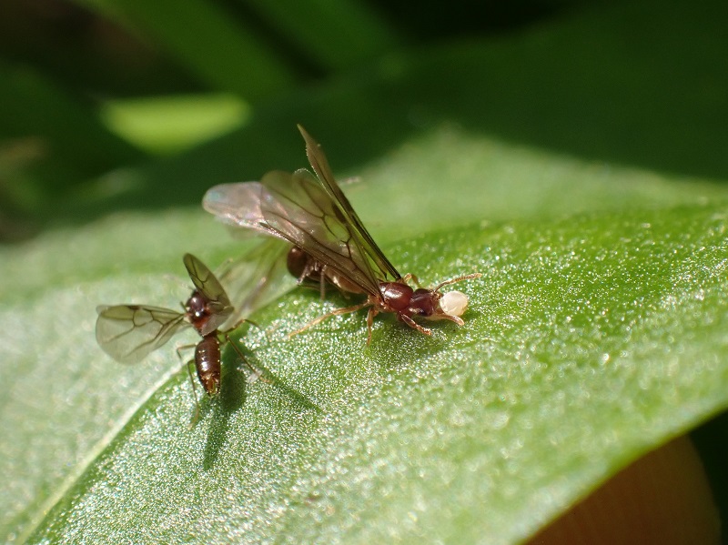 - よく晴れた朝、大規模な羽アリの群れに出会いました。春から初夏にかけて見かけるアリの結婚飛行ですが、数千どころでは済まないほどの群れは初めて。種類を調べるため、草の上に止まっていた個体を観察すると、体の大きな女王アリの口には白い塊(写真)。これはアリノタカラというカイガラムシの一種で、それを巣で増やし、分泌物を食べる習性のあるミツバアリだとわかりました。新女王は、アリノタカラを必ず1匹くわえて新天地へ持っていく習性があります。
