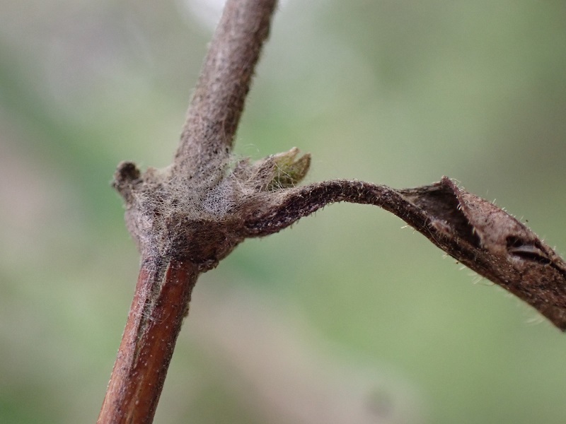 - 標柱1番のスイカズラのつるに、葉の一部分が糸で綴られたイチモンジチョウの幼虫の越冬巣(写真)がありました。中はもう空ですが、周りの古い葉が落ちてもしっかりと枝に残っています。葉柄の付け根をよ〜く見ると、糸で何重にも補強されていました(クリックで拡大)。長い冬を乗り越えるための安全対策がバッチリです! その近くでは2cmほどに成長した幼虫を発見。来月には新成虫が見られることでしょう。