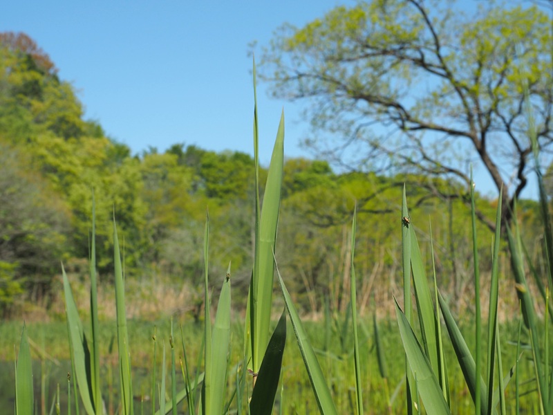 - 湿地に水が行き渡り、澄んだ水面には青空と雲がきれいに反射していました(写真)。八ツ橋の池ではヨシやガマが生長。アサザが葉をひろげ始め、水辺に緑を添えていました。