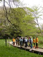 - 今日は、与野南小学校3年生の皆さんが総合学習の授業の一環として来園しました。班ごとに協力して、生きもの探しや園内の探検(写真)をしました。特に、草笛作りではとっても盛り上がりました。