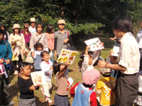- 中央保育所つばめ組のご家族が、交流会で遊びに来てくれました。イナゴさがしやどんぐり拾いなど、親子で楽しく自然観察をしました。写真は、拾った落ち葉を切り貼りして、できた作品を見せ合いっこしているところ。ハートやカメ、お花など、葉っぱの色を生かした作品ができあがりました。