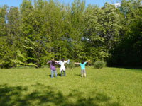- そんな最高の陽気に遠足で来園してくれたのは、百合ヶ丘幼稚園のみなさん(写真)。オタマジャクシを見たり、新緑のトンネルとなっている小道で耳をすましたり、ノウサギになって草はらを走り回ったり、五感を使って自然をフルに体感しました。また夏にお待ちしてます!