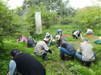 - 園内管理ボランティアでは、外来植物「セリバヒエンソウ」の駆除をしました。ローラー作戦で片っ端から抜きに抜き、予定していた場所のほとんどを除去することができました。高い湿度に大汗をかきながらも、13名の大きな力でとてもスムーズに終わりました。ありがとうございました(写真)。
