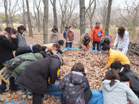 - 「生きものいきいき隊」は、前回に引き続き高尾の森のお手入れがテーマ。落ち葉かきをして、林床植物に日が届くようにしました(写真)。春になればたくさんの植物たちの芽が出るはず♪ 落ち葉に埋もれていたジャノヒゲの青いタネや、イイギリのオレンジ色の実を観察しながら楽しく作業できました。