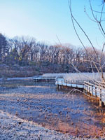 - 冬の空気に包まれました。朝、センター横の温度計の最低気温は-4℃! 公園中が霜で真っ白になり(写真)、日を浴びた所がキラキラと輝いていました。