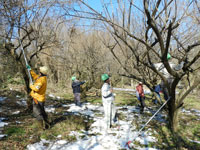 - ボランティアのみなさんと、梅林の枝の剪定を行いました(写真)。日陰には雪が残るものの、風もなく穏やかな陽気。少し動くと体はぽかぽか! 「絶好のお手入れ日和だね〜」と、作業もはかどりました。おかげさまで、標柱11番の梅林の手入れは完了です。ご協力ありがとうございました。