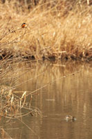 - 朝からどんより曇り空…。一方で、昨晩は気温が氷点下にならなかったので、高尾の池は久しぶりに氷が張らず、コガモたちの求愛の鳴き声でにぎやか♪ また、カワセミがホバリングしたりヨシにとまって水面をじぃーっとみつめたりして魚を探す様子が観察できました(写真)。