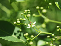 - 満開のイボタノキの花は千客万来、いろいろな虫たちが吸蜜にやってきていました。ご常連はコアオハナムグリ、クロハナムグリ、ヒメトラハナムグリといった甲虫類。ハチによく似たハナアブ類も多く、今日は大型のクロベッコウハナアブや金緑色の光沢が美しいルリハナアブも見られました。