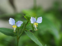 - ピンク色の花が多い湿地で、ひときわ目立つのが青いツユクサの花。昔は着物の絵柄を描くときに、この花を絞った青い汁を使ったそうです。ただ、水であっという間に消えてしまうため、下絵に利用されたようです。そんな青が特徴的なツユクサですが、色の極端に淡い株(写真)をふれあい橋付近で見ることができます。出会う機会が少ないせいか、新鮮でおしゃれに見えます。