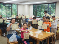 - 手作り実験教室は「公園の植物で染めもの体験」。まずは染料のもとになる材料をとりに公園へ。今回は外来種のシンジュとオオブタクサを使いました。真っ白だった布が、シンジュは鮮やかな菜の花色、オオブタクサはしぶ〜い茶色に変身!(写真) 草木染めを楽しめた上に、外来種の抜き取りもできて一石二鳥の回になりました♪