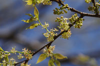 - 雑木林ではコナラ、クヌギの他にエノキ(写真)も開花しています。近づいて見ても咲いているのかわからないような小さな花。それでも目を凝らすと、小枝にたくさんついていることに気付きます。エノキは春の花だったんだなぁと、改めて実感しました。