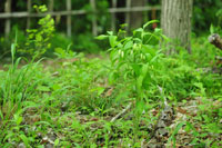 - ここ数日で緑がぐんと増えました(写真)。一口に緑色と言ってもバリエーション豊か。あわ〜い緑や、赤みを帯びた緑、まぶしいライトグリーンなどなど。めだかのT字路から高尾の森を眺めると、よく分かります。