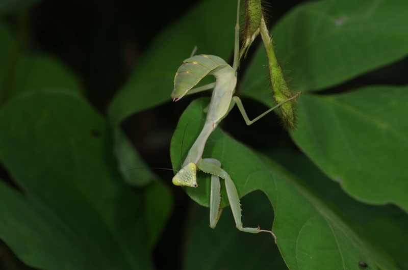 - センター脇に設置してある緑のカーテン。ウマノスズクサやヘクソカズラの花、ヤブガラシの実、いまにも咲きそうなセンニンソウのつぼみなど、つる植物のいろいろな姿を観察できます。今日はさらに、産卵に来ているジャコウアゲハの成虫、ウマノスズクサを食べる幼虫、顔の模様が特徴的なツチイナゴの幼虫、虫たちを狙うオオカマキリなど、多種多様な生きものたちが見られました。
