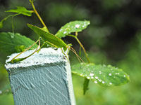 - 1日中雨模様。おまけに吐く息が白く見えるほどの寒さでした。木道沿いで見つけたセスジツユムシ(写真)は体中に雨滴をつけてじっとしていました。
