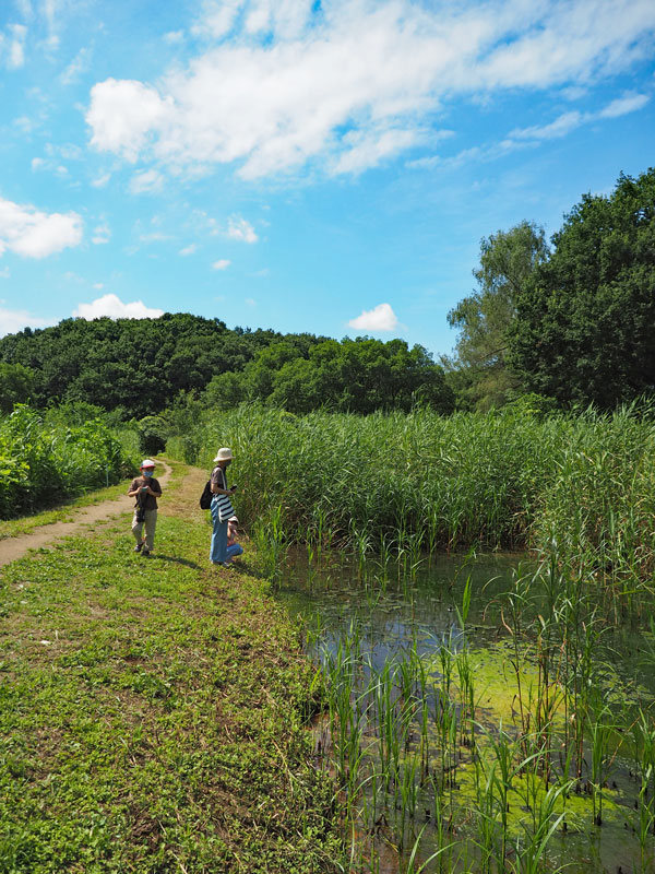- 長梅雨から一転、晴天の公園はトンボパラダイス!! 標柱13番付近の池を飛び交うシオカラトンボやギンヤンマに、子どもたちが熱視線を送っています(写真)。林縁にハグロトンボ、木道沿いにはオニヤンマ。そして、高尾の池の縁ではオオヤマトンボが見られました! 姿がそっくりなオニヤンマが流れのある小川に生息するのに対し、こちらは開けた水面を好みます。