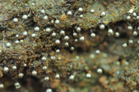 - 標柱3番近くで、朽木の上にギッシリと生えるアミホコリの仲間を見つけました(写真)。ルーペを使って観察してみると、まるで変形菌の森のよう♪ 小さくなって探検してみたくなりました。