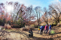 - 第2回目の「初級者のための写真講座」では『風景』をテーマに行いました。冬の景色を表現するための光と影のとらえ方や、ホワイトバランスといったカメラ設定などを室内講義でレクチャー。野外では枯れ葉が残る雑木林で、太陽をとり入れた表現方法や構図の切り取り方、アングルの違いなどを実写で確認し、カメラを通して冬の自然を楽しみました(写真)。