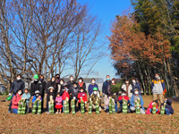 - 野あそび教室「自然でアート! 木の実とはっぱ」を開催しました。林をずんずん進み、この時期ならではの自然あそびに挑戦!! 大きなホオノキの葉っぱでお面づくりや、ふかふかに積もった落ち葉でお風呂とシャワー♪ ヒサカキの実をつぶすと、インクのようなきれいな紫色にびっくり! また、ケヤキの幹にイチョウやモミジの葉を水でペタペタと貼りつけ、思い思いにアート作品も作りました!(写真)