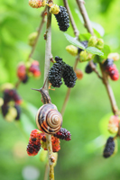 - 一日中、雨模様…。そんな今日は、しっとり濡れた地面からベニタケの仲間が、朽木からキクラゲがにょきにょき♪ 実が熟し始めたクワの木では、ミスジマイマイも見られました(写真)。
