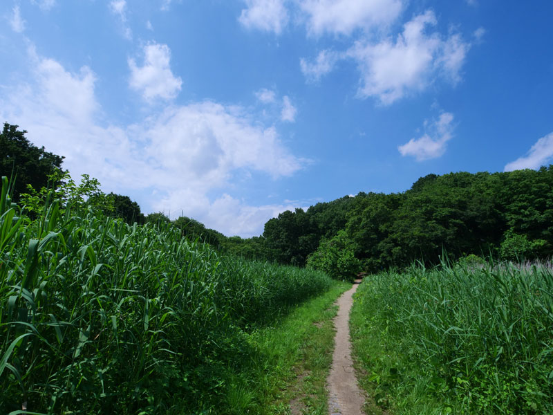 - 写真は八ツ橋の池の様子。ヨシやウキヤガラの茂みから、カイツブリの「キュルルルル…♪」という元気いっぱいの鳴き声が聞こえてきました。