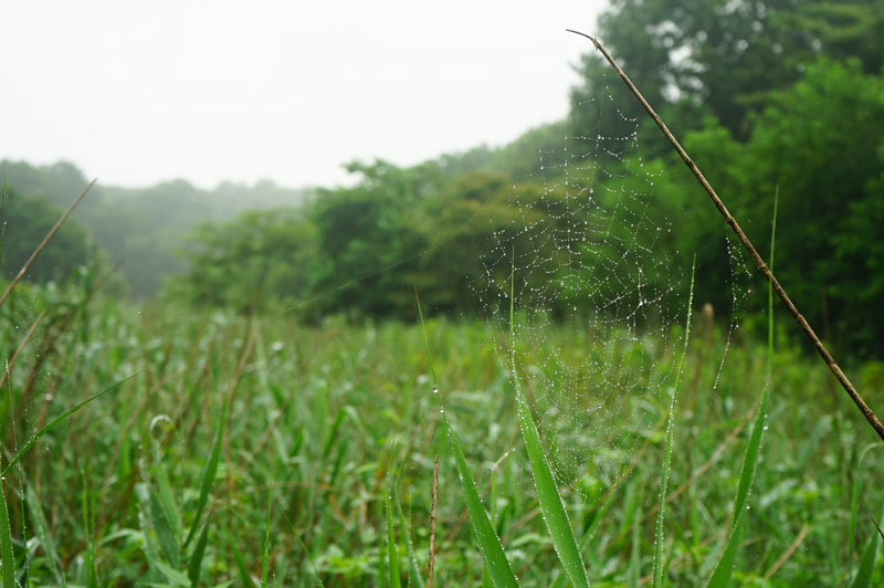 - 公園のどこもかしこも雨滴をまとってキラキラ♪ ミズキの実やエゴノキの実、湿地ではクモの網がビーズのように輝いていました(写真)。