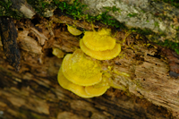 - 標柱3番近くで、朽木から生えるたくあんを発見!?…ではなく、黄色い変形菌のアメーバがきのこにまとわりついて、捕食しているシーンでした(写真)。アメーバはじわじわときのこを溶かし栄養を得て、しばらくすると移動します。