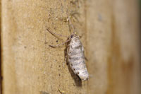 - この時季、公園の門柱にフユシャクガの仲間がよく止まっています。今日はシロオビフユシャクのオスが見つかりました。そして巡視の途中、標柱7番付近の木杭で、今度はシロオビフユシャクのメスに出会いました(写真)。12〜1月の厳冬期に出現する種類で、メスには翅がまったくありません。