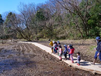 - 育ちの森幼稚園から年中組のみなさんが来園しました(写真)。ぽかぽかの陽気のなか、元気いっぱい公園の春さがしに出発! ウサギの耳のようなハルジオンの葉にふれたり、ヤエムグラを服にくっつけたりして遊びました。水辺では、ツクシや群れで泳ぐミナミメダカを観察。のびのびと生きものとふれあいました。